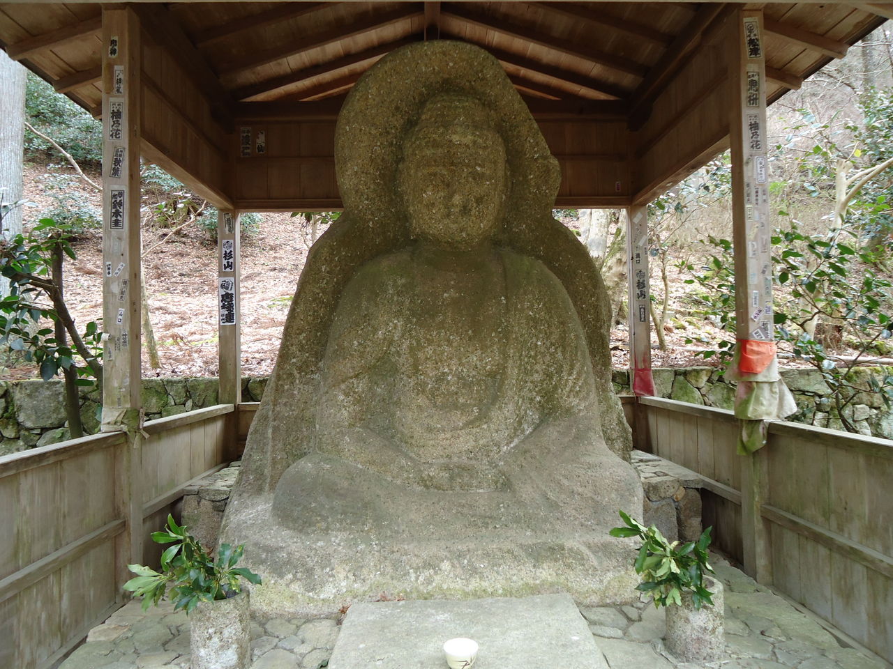洛北大原の里、三千院の境内に、高さ225cmという京都市では最大級の石仏が仮屋の中に大切に祀られています。鎌倉時代に造られたという古いほとけ様ですが、風化も比較的少なく、目を細めて見れば当初の優美なお姿がくっきり見えてくるようです。